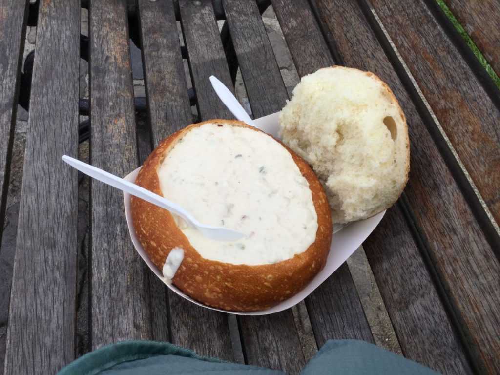 名物のサワドーブレッド(重曹を使ったパン)を器にしてクラムチャウダーを入れたものを屋台で買ってみる。これが初めての買い物で、10ドル。直径は20cmもあろうかというほどでっかくて、とても全部は食べられなかった・・・うーん、味も今ひとつ・・・