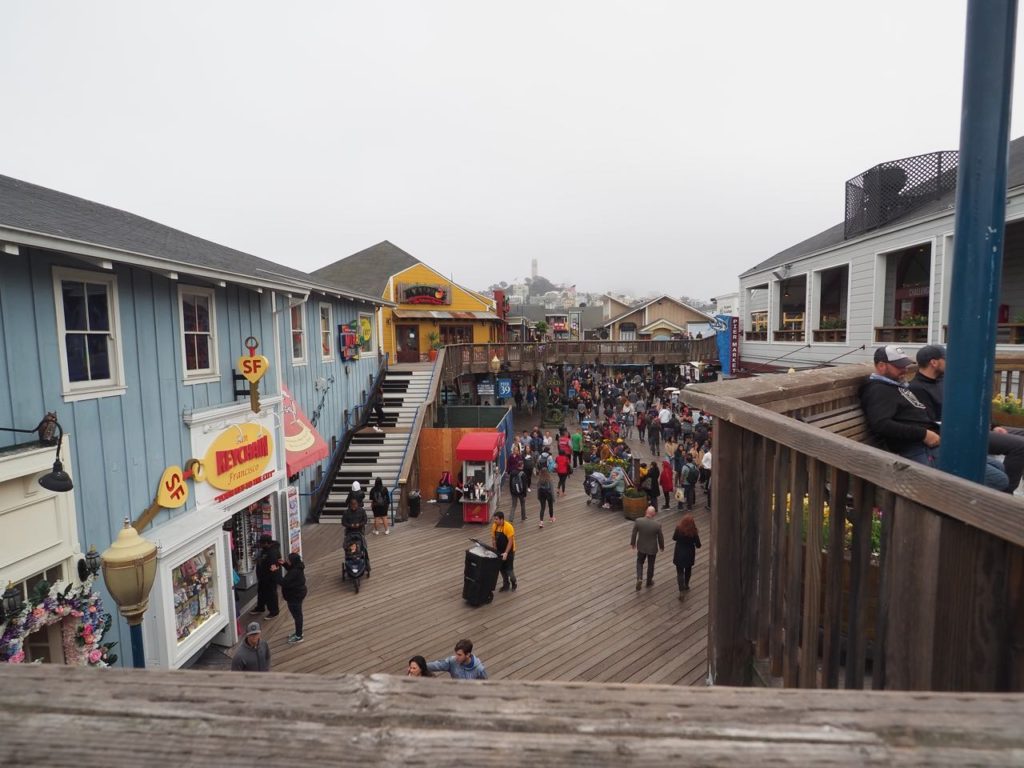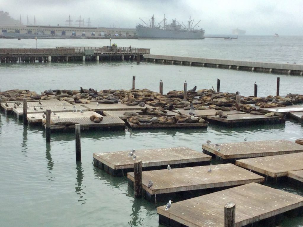 アシカ(Sea lions)は大人気で、板の上でアシカ同士の陣地争いに見物客は大喜びしていた。ここのアシカは野生のアシカで、1989年の地震以降、現れるようになり数が増えたとのこと。なぜここにやってきたかは不明らしい。なかなかユニークな眺め。