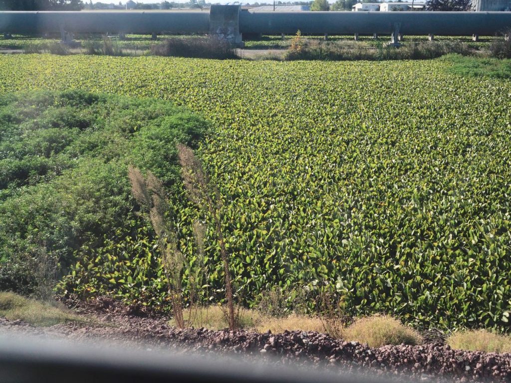 これは列車が止まっていた時に写した風景。一面の緑は湿地の植物っぽい。