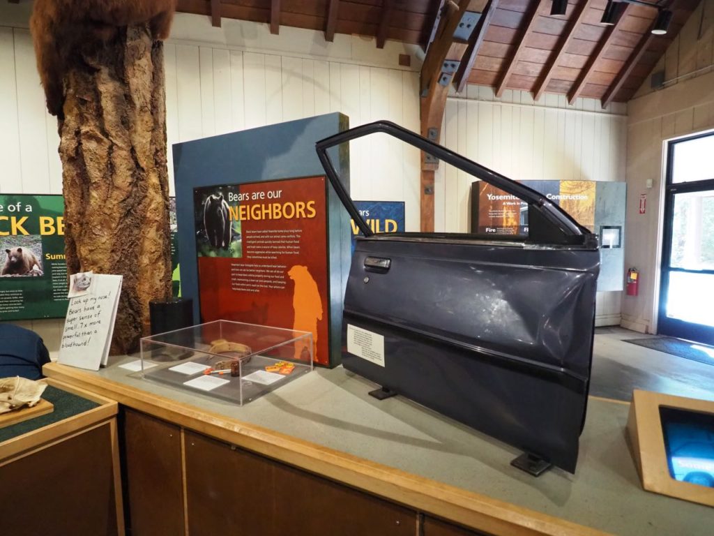 ブラックベアが人間の食べ物を漁る、食べる、ということが、ヨセミテでは大きな課題になっている。ゆがんだ車の扉は、ブラックベアの仕業。