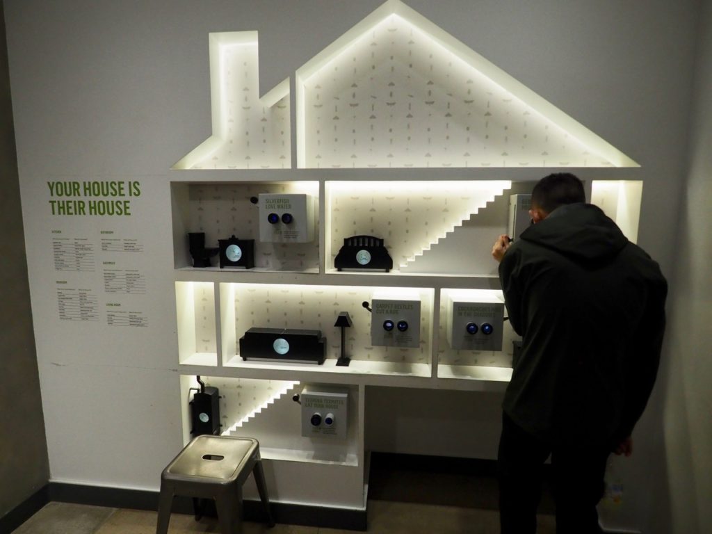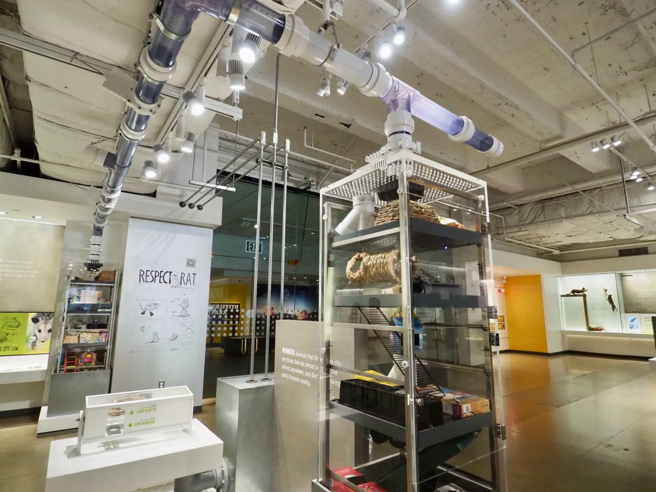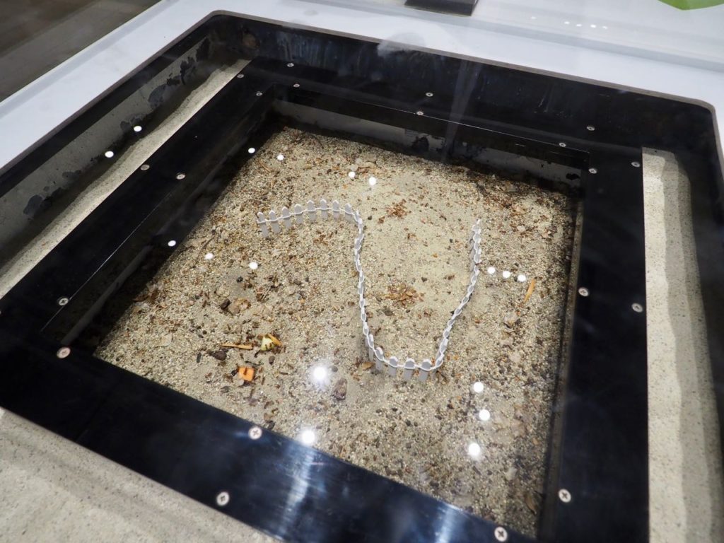 向こうとこっちのガラスケースに人工物を置きごちゃごちゃさせてあり、両方をつなぐパイプの中を行き来できるようになっている。