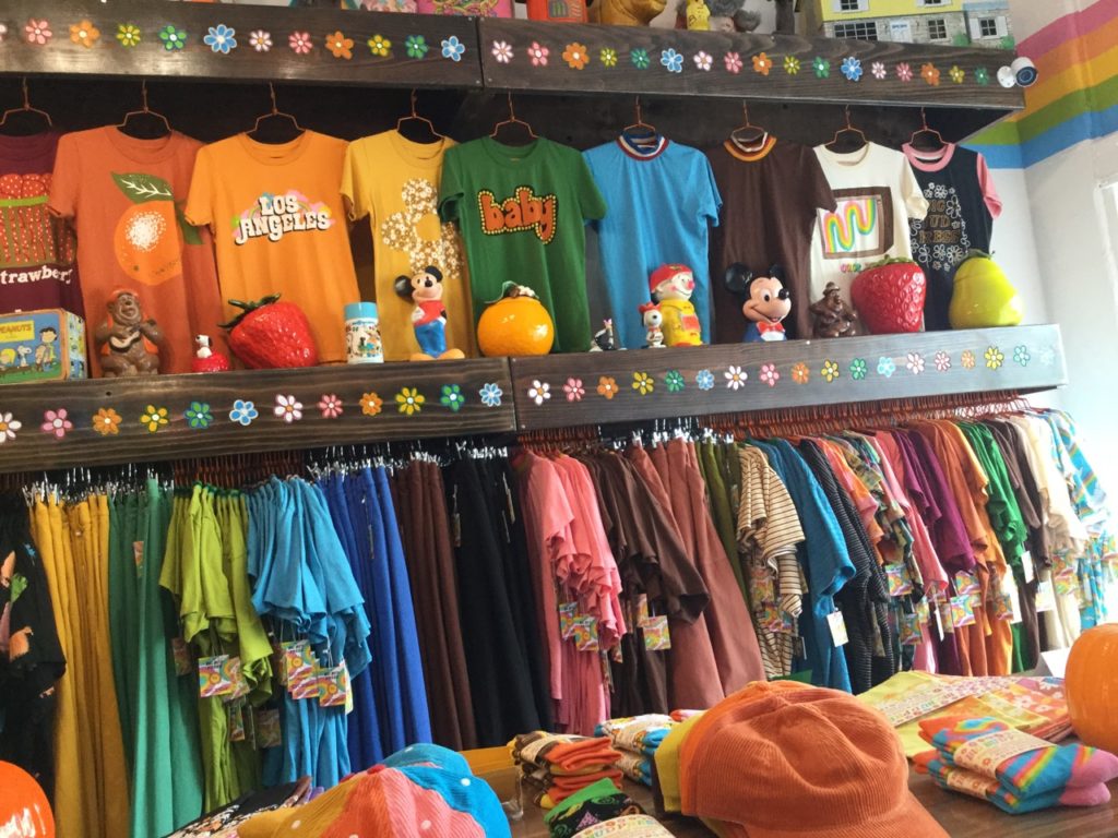 ロサンジェルス生まれの元気でかわいいお店。レインボーカラーの楽しい服や雑貨が並ぶ。