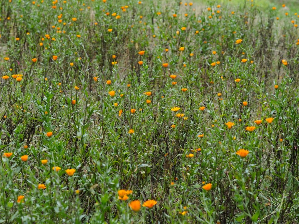 色合いの鮮やかなカレンデュラ(色合いのよいものを選んで摘んでいるそう)、さまざまな病気に効能があるといわれるエキナセア、低木状のオトギリソウの仲間、Hypericum。オトギリソウは日本でも効能がある薬草として知られているから、納得。(オトギリソウ・弟切草の名の由来も、薬効が高いことから起こった悲劇のおはなし。)