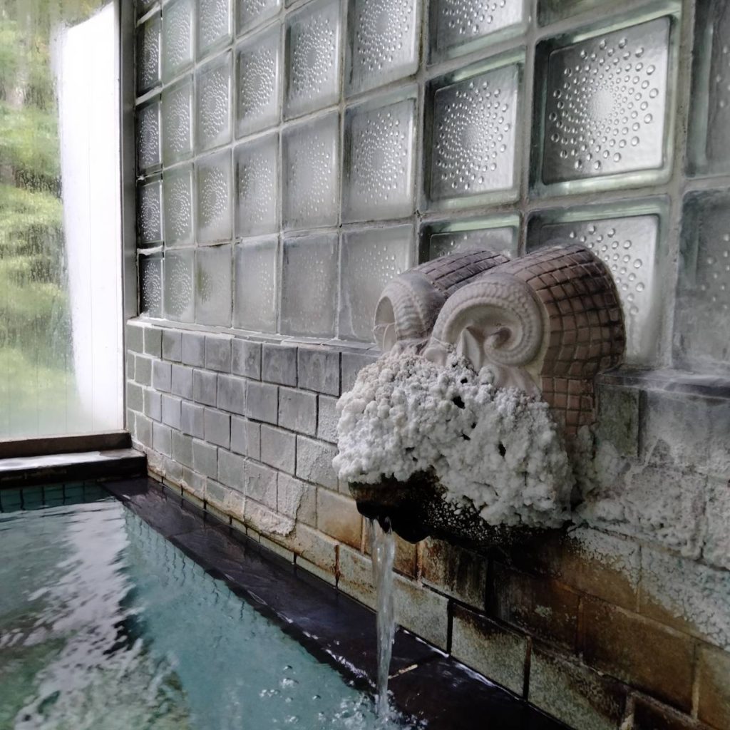 温泉口は温泉成分の結晶が付着して、白くでこぼこなっているのだが、それを羊にみたてているなんて、なかなかよいセンスだね。