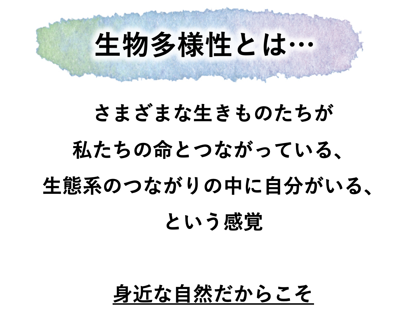 生物多様性がなにか、ということをテストの回答みたいに覚えることはできるけれど、私はもっと本質的なところで、さまざまな生きものたちが私たちの命とつながっているんだ、生態系のつながりの中に自分もいるんだ、という感覚をもてることがとても大切だと思っている。