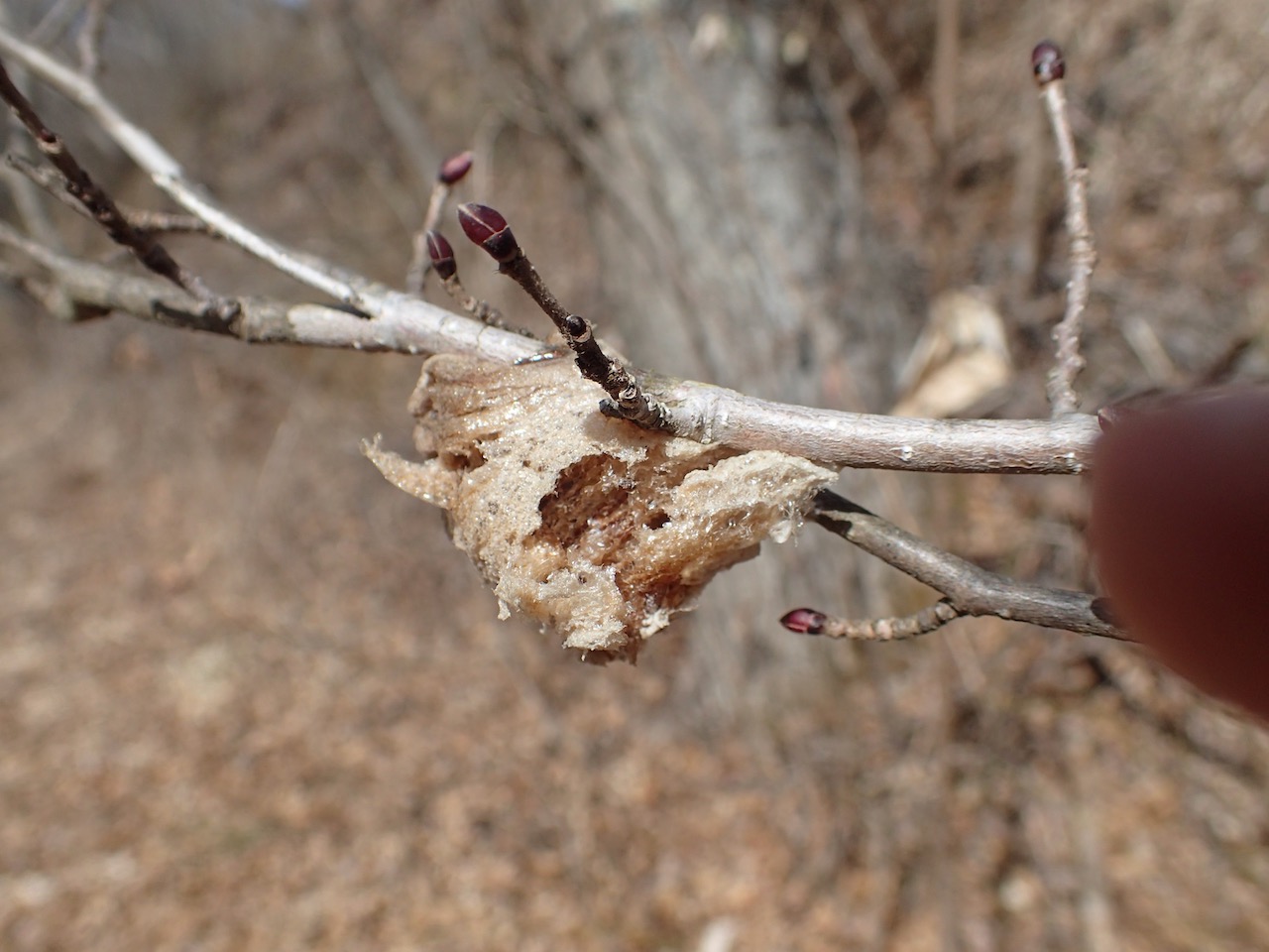 おや、こちらは目の高さに産み付けられたカマキリの卵。どうやら鳥につつかれて食べられている。