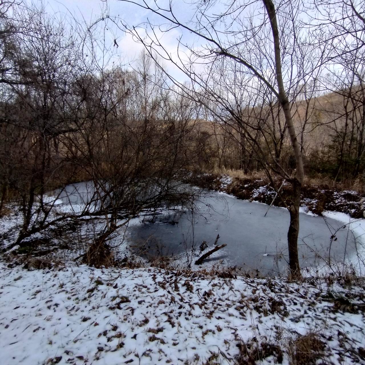 このまえ白く凍っていたため池は、ずいぶん解けてた。