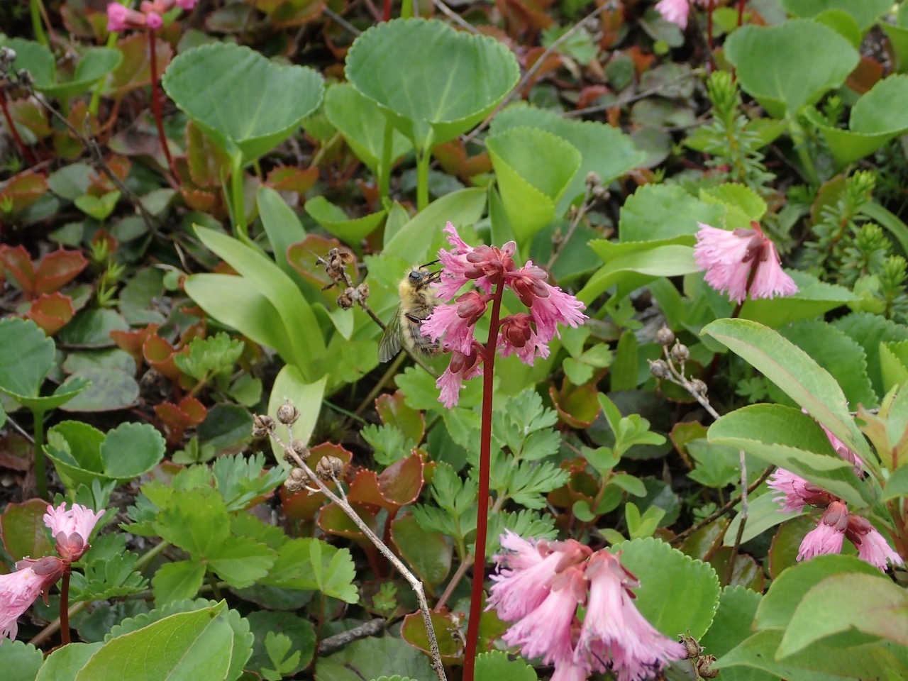 イワカガミの花を次々と訪れるミヤママルハナバチ