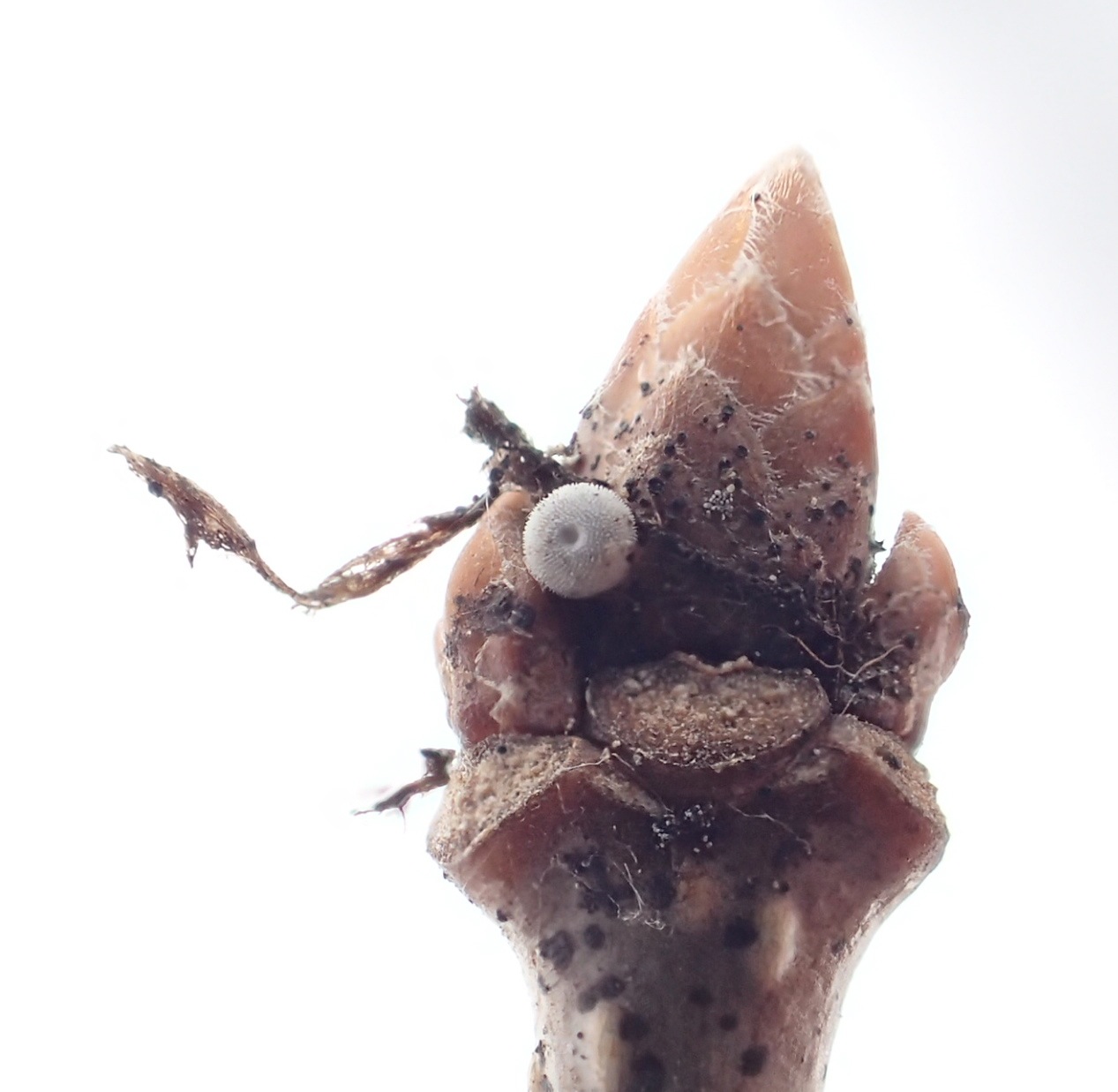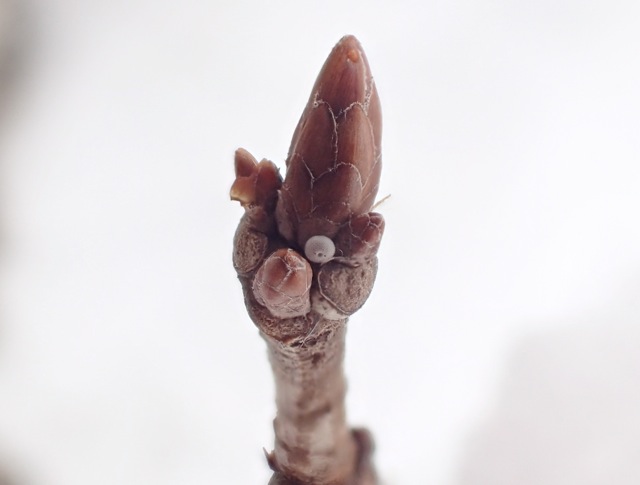 ミズナラの芽についているゼフィルス類の卵を接写。