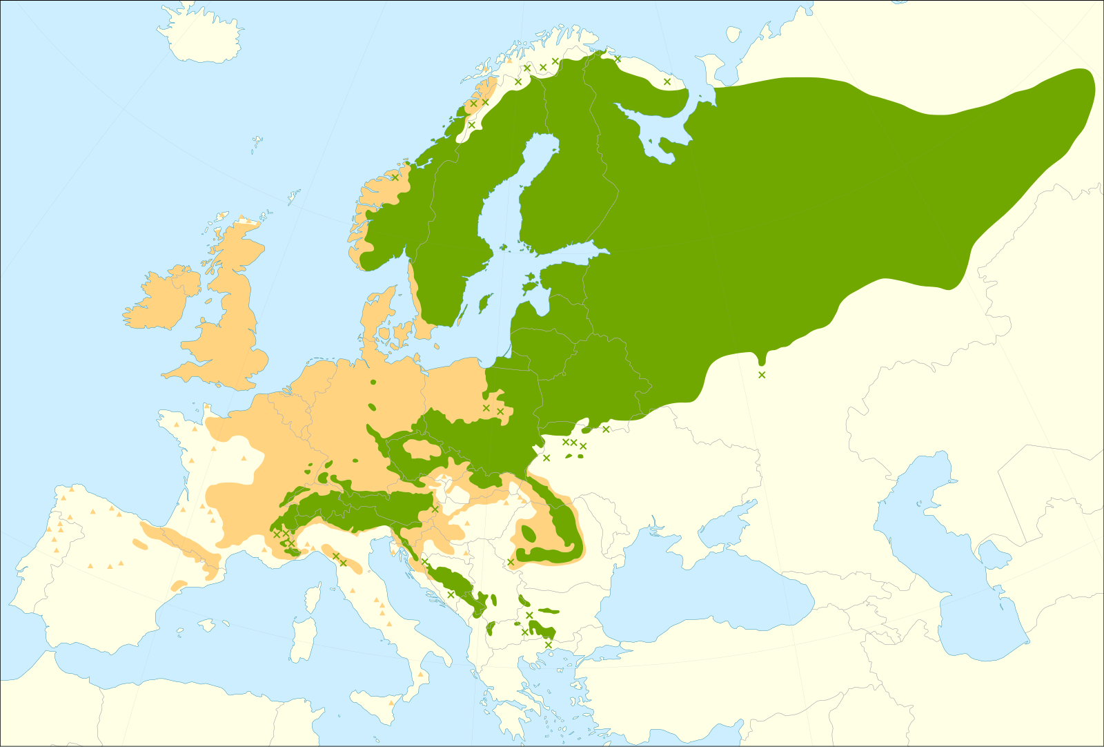 ヨーロッパトウヒの自生範囲は下図のように、本来の分布の中心は東〜北ヨーロッパにある。自生するエリアは、スウェーデンは全土であるが、ドイツは南西〜南の国境付近のみだ。ドイツのヨーロッパトウヒはかなり人為的に植林されているのがわかる。(出典:https://www.euforgen.org/species/picea-abies)