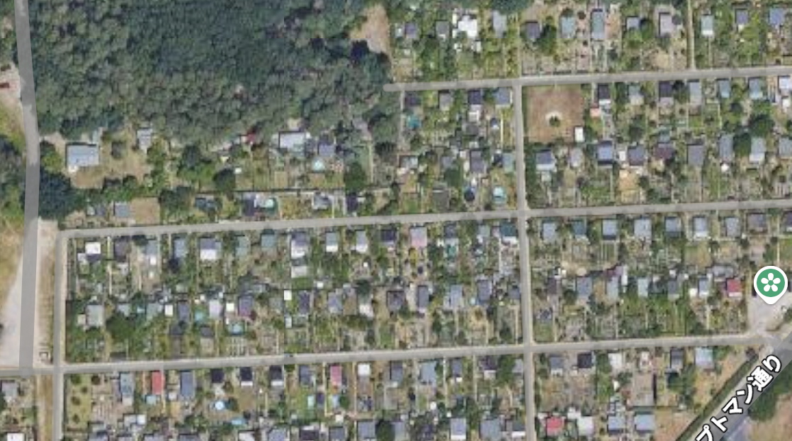 実際にドイツを移動していると、四角く区切られた小さな庭がたくさん集まった、なんともかわいらしいクラインガルテンの景色をたびたびみかけた。Googleマップで上からみると、全体の面積はけっこう広くて驚く。ただし塀で囲んであり、残念ながら近くからはよくみえない。なかはどうなっているんだろう、という思いがふくらんでいた。