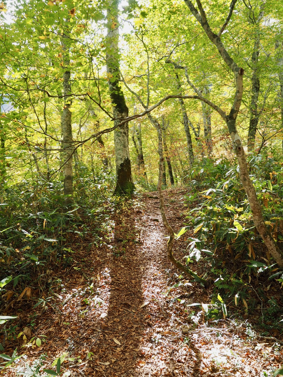 森の中に足を踏み入れた時、ブナの極相林と比べると、樹種が多くなったことがわかった。森の階層の分布、葉の形、色合い、樹林の明るさ・・・さまざまな要因が重なって、そのことが感じられる。