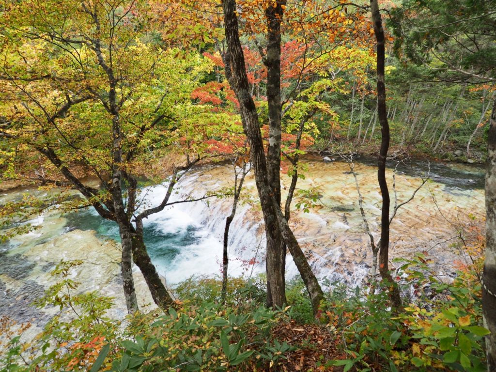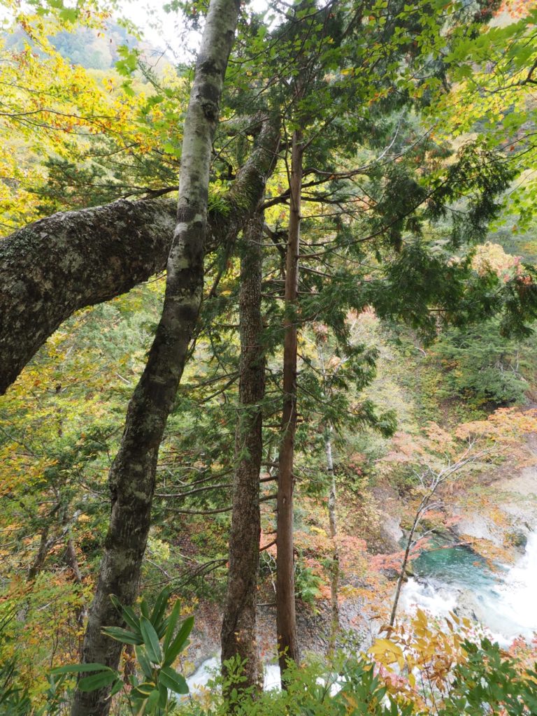 森は雑魚川沿いに続いている。河床の岩肌は白く、流れは蒼く澄んでいる。