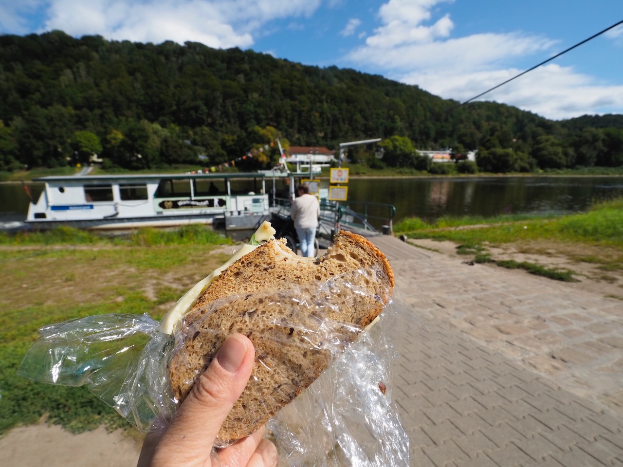←船が出発するまでの時間に、腹ごしらえ。朝、家でつくってきたサンドイッチ。